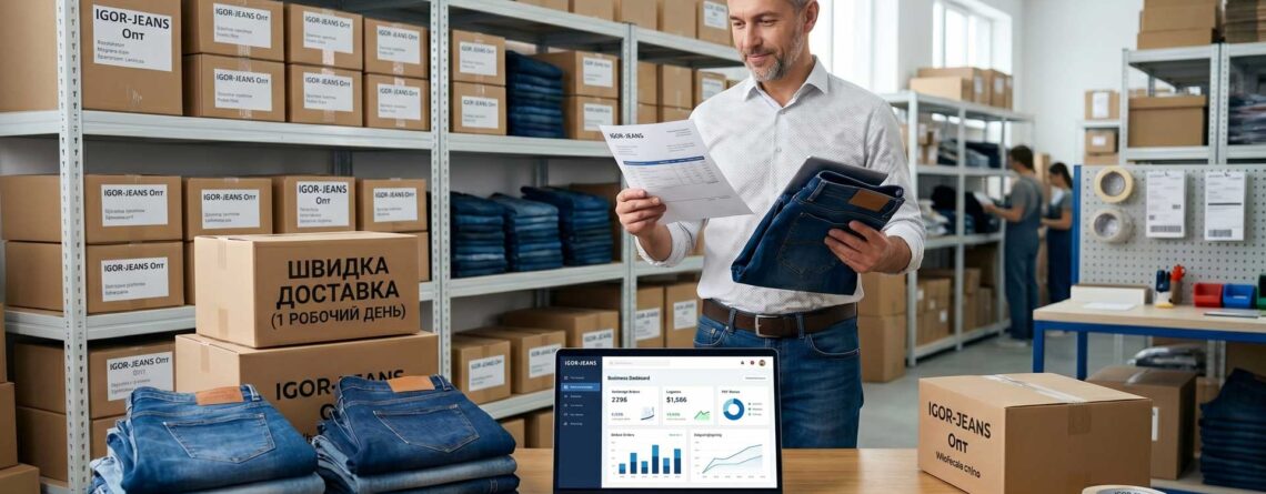 Як замовити джинси оптом онлайн? Покрокова інструкція для підприємців: вибір постачальника, оформлення замовлення, перевірка якості та доставка по Україні.